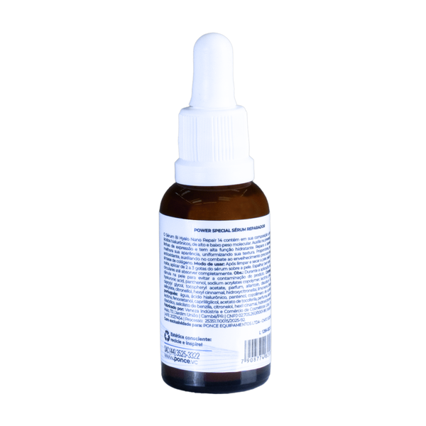 O Power Special Sérum Reparador Bi Hyalo Nano Repair 14 contém em sua composição a junção de dois ácidos hialurônicos, de alto e baixo peso molecular. Auxilia na prevenção de rugas e linhas de expressão e tem alta função hidratante. Repara a barreira da pele e melhora sua aparência uniformizando sua textura. Proporciona, também, ação antioxidante, auxiliando no combate ao envelhecimento precoce e estimulando à síntese de colágeno.